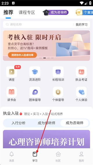 3、登錄后即可進(jìn)入APP學(xué)習(xí)頁面,使用講座、流派進(jìn)階、長程培訓(xùn)等相關(guān)功能。