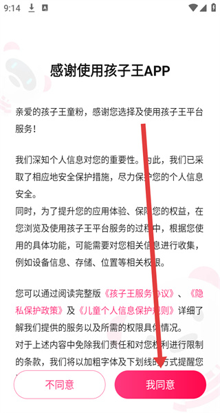 1、點擊“感謝使用孩子王APP”彈窗的“我同意”,進入選擇城市頁面。