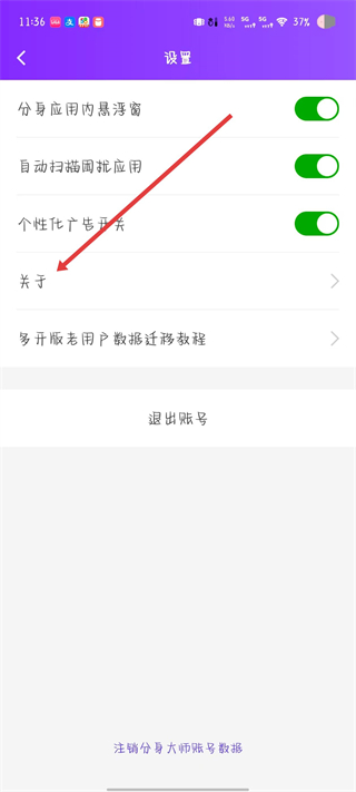 2、在設(shè)置頁面中,選擇關(guān)于選項(xiàng),進(jìn)入關(guān)于分身大師頁面。