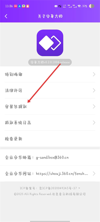 3、進(jìn)入關(guān)于分身大師頁面之后,點(diǎn)擊安裝包提取的選項(xiàng)。