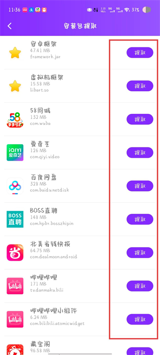 4、進(jìn)入安裝包列表頁面,找到目標(biāo)應(yīng)用后點(diǎn)擊右側(cè)的提取即可。
