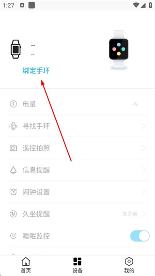 2、在設(shè)備頁面,點擊綁定手環(huán)選項。