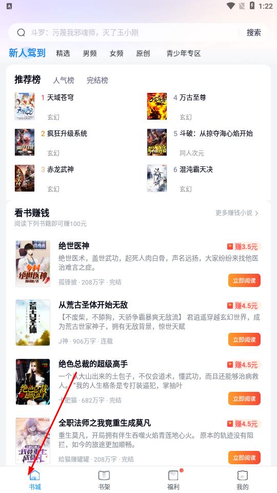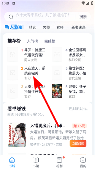 1、點擊底部導航欄的書城,進入書城頁面,可瀏覽新人駕到板塊下推薦榜的玄幻、同人次元等類型小說,還能參與看書賺錢活動,點擊立即閱讀賺取收益。