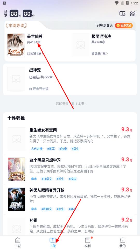 2、點擊底部導航欄的書架可查看本周導讀中已讀書籍,同時瀏覽個性強推板塊推薦的古代言情、都市等類型小說如重生嫡女有空間,這個明星只想學習等。