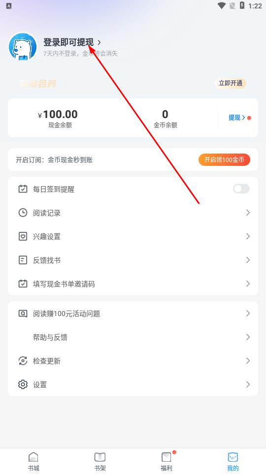 3、點擊底部導航欄的我的,進入個人中心頁面,頂部通過登錄即可提現(xiàn)入口完成登錄后,可管理現(xiàn)金余額如顯示¥100.00、金幣余額,進行興趣設置、反饋找書等操作。