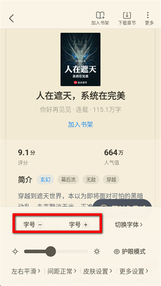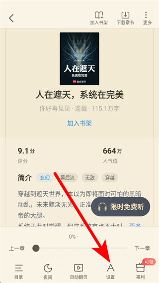 2、在小說詳情界面,點擊下方設置選項,彈出設置菜單。