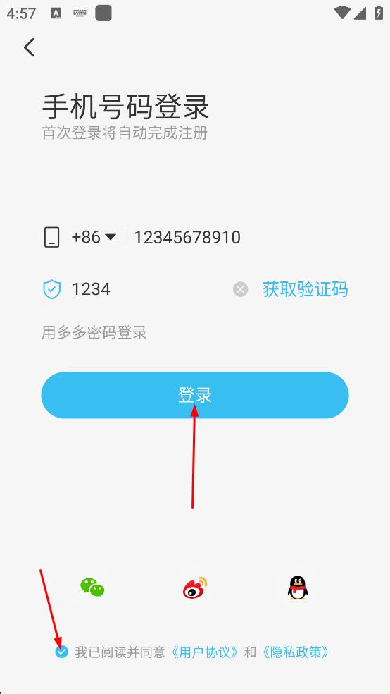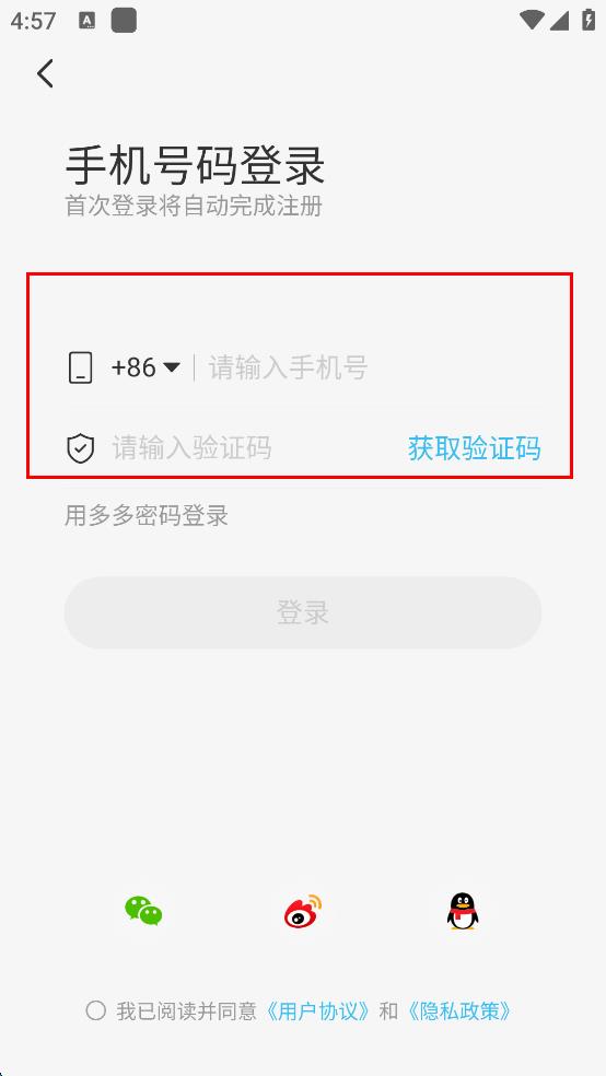 3、輸入手機號,獲取并輸入驗證碼,勾選同意用戶協(xié)議和隱私政策。