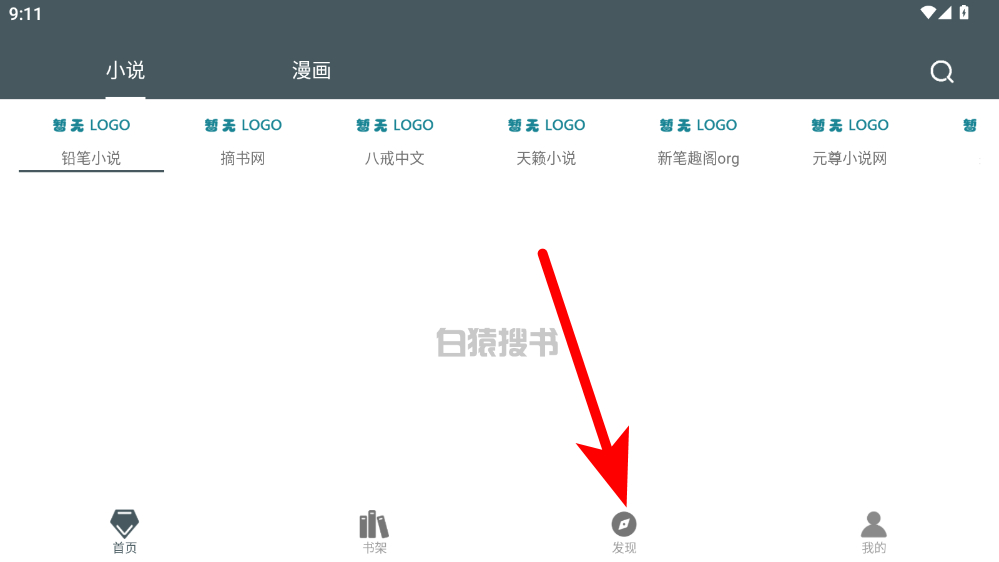 1、在搜書應用首頁,點擊底部發(fā)現(xiàn)選項,進入發(fā)現(xiàn)頁面。