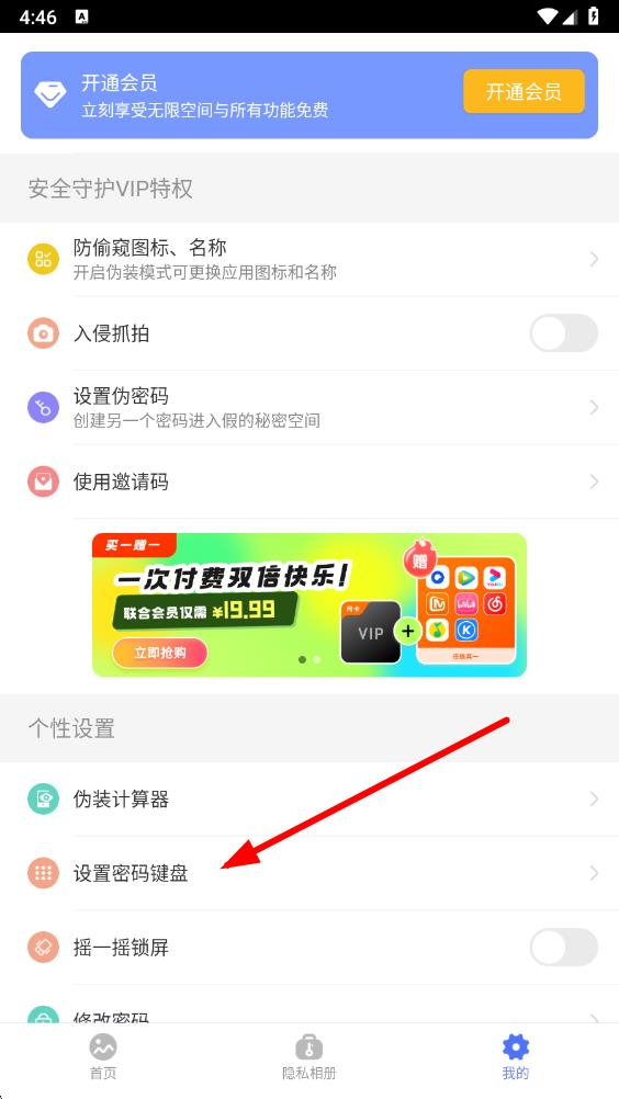 2、在我的界面中,找到并點(diǎn)擊設(shè)置密碼鍵盤選項(xiàng)。