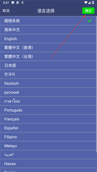 4、在語言選擇頁面,選擇想要設(shè)置的語言,點擊右上角的確定。