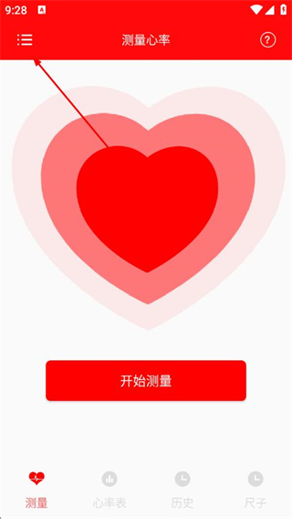 1、打開心率檢測儀APP,點(diǎn)擊左上角三條橫線的菜單圖標(biāo)。