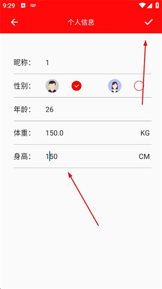 3、修改身高數(shù)值后,點(diǎn)擊對勾,即可完成身高數(shù)值修改操作。
