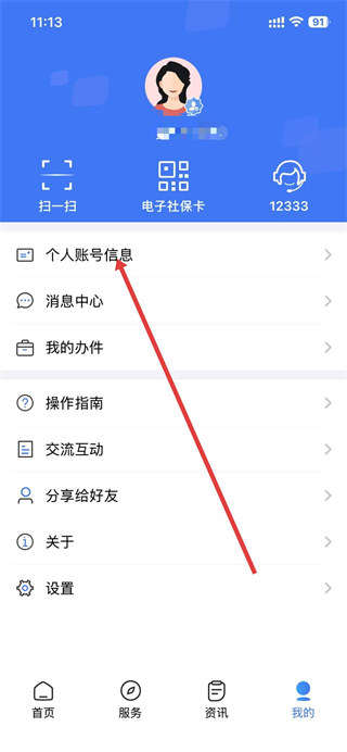2、在我的頁面中,找到并點擊下方的個人賬號信息選項。