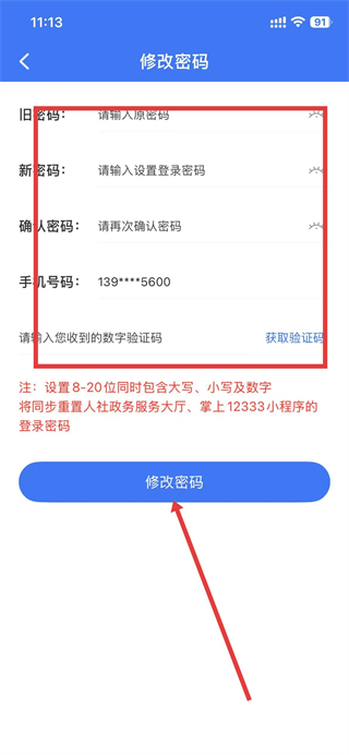 4、根據(jù)要求填寫信息,點擊修改密碼,即可完成密碼修改。