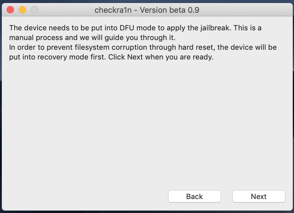 3、打開checkrain,電腦連接上iOS設備,按下一步。根據(jù)提示,手機進入DFU模式