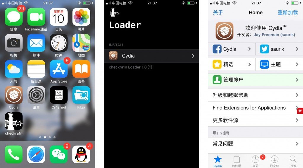 5、啟動后設備桌面出現(xiàn)checkra1n App 雙擊打開安裝Cydia