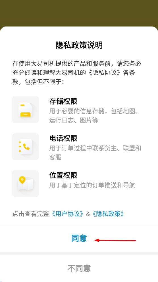 1、打開(kāi)大易司機(jī)APP,在彈出的“隱私政策說(shuō)明”提示框中,點(diǎn)擊“同意”按鈕,進(jìn)入APP主界面。