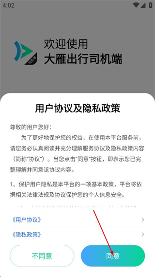 1、進(jìn)入大雁出行司機(jī)端的用戶協(xié)議及隱私政策頁面,閱讀相關(guān)內(nèi)容后點(diǎn)擊同意按鈕,完成協(xié)議確認(rèn)步驟。
