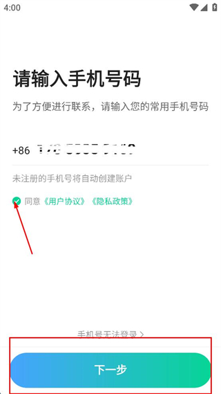 3、勾選同意用戶協(xié)議及隱私政策的選項(xiàng),隨后點(diǎn)擊頁面下方的下一步按鈕,推進(jìn)注冊(cè)操作。