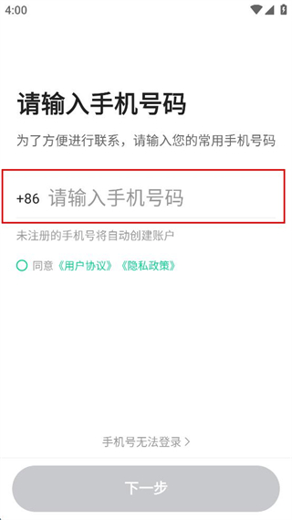 2、進(jìn)入請(qǐng)輸入手機(jī)號(hào)碼頁面,在對(duì)應(yīng)輸入框中填寫常用的手機(jī)號(hào)碼,準(zhǔn)備進(jìn)行后續(xù)的注冊(cè)流程。