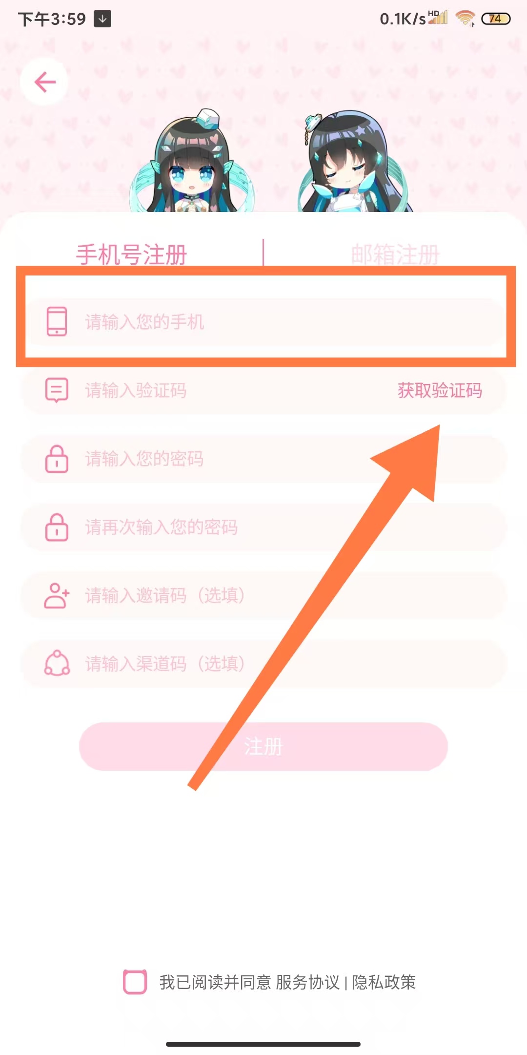 2、在注冊(cè)界面,選擇手機(jī)號(hào)注冊(cè),輸入手機(jī)號(hào)碼,點(diǎn)擊獲取驗(yàn)證碼。