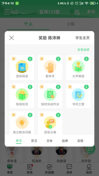 老師只需要點一點,就能提高課堂氣氛,告別以往枯燥的點評方法,全方位,多維度的點評方式,既減輕老師的評價負(fù)擔(dān),也增強學(xué)生課堂上和校園生活的積極性,同時會自動生成班級、個人的個性化綜合素質(zhì)評價報告,定期推送到多個用戶端,以鼓勵孩子成長,促進學(xué)生綜合素質(zhì)發(fā)展。老師可以自定義點評類型,分?jǐn)?shù),同學(xué)間也可以參與點評互動,也便于校園管理者的全局管理。