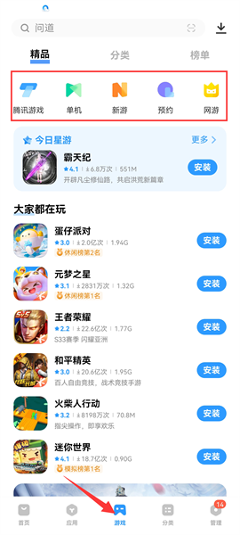 2、在【游戲】欄目,上方有根據(jù)游戲不同類型進行細致劃分,若是沒有目標,可以看看大家都在玩的游戲,都是網(wǎng)上最火熱最受歡迎的游戲;