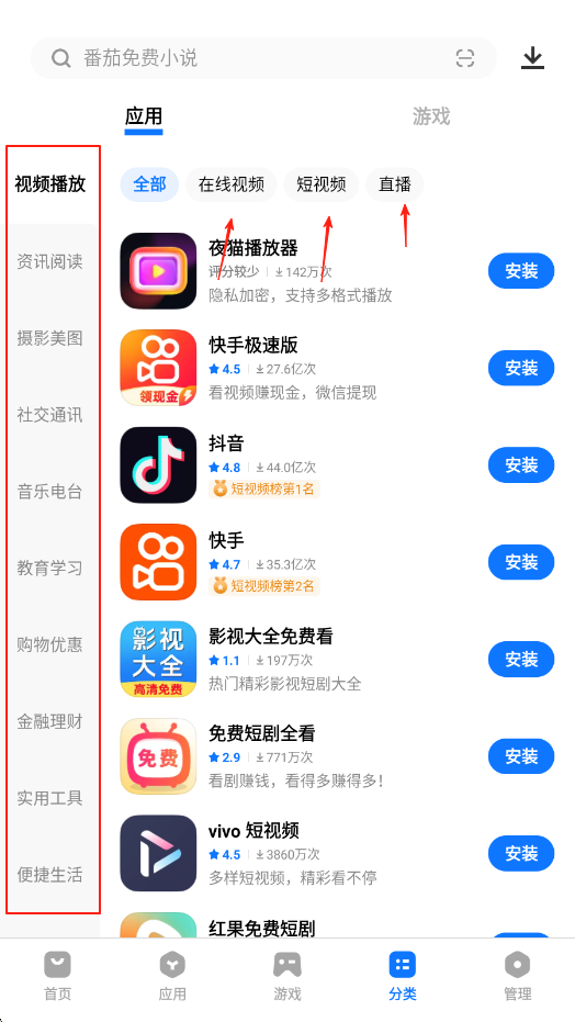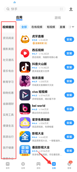 3、點擊底部分類選項,進入分類頁面,左側(cè)有視頻播放,資訊閱讀等多種分類,選擇對應(yīng)分類后,右側(cè)可查看該分類下的具體應(yīng)用。