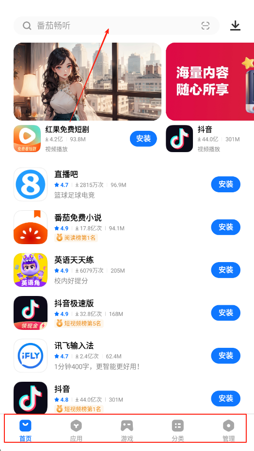 1、打開應(yīng)用商店,在首頁頂部搜索框中輸入想要查找的應(yīng)用名稱,等待搜索結(jié)果加載出來,也可直接瀏覽首頁推薦的各類應(yīng)用。