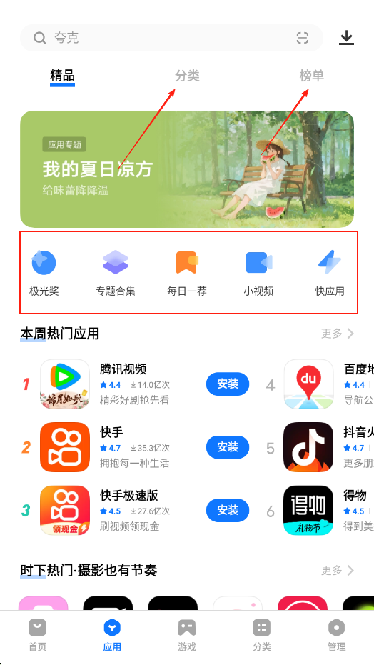 2、點擊底部應(yīng)用選項,進入應(yīng)用頁面,可查看精品,分類,榜單等板塊,還能通過極光獎,專題合集等快捷入口,快速找到優(yōu)質(zhì)應(yīng)用。