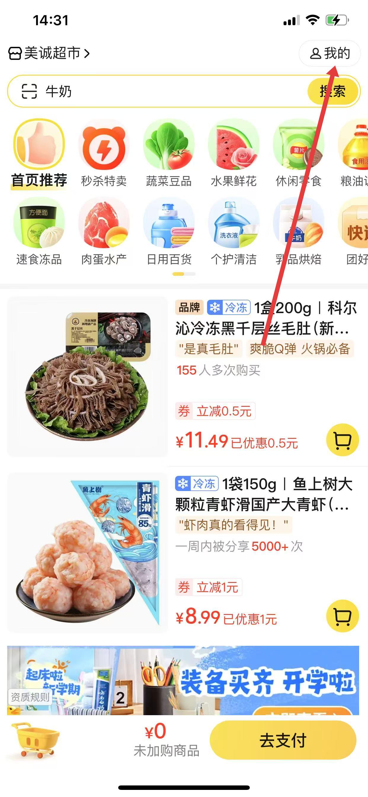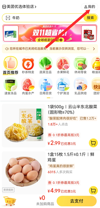 1、打開美團優(yōu)選界面,點擊右上角我的,進入個人頁面。