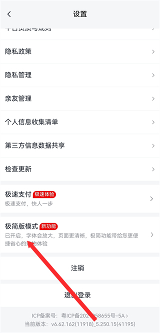 3、在設置頁面,找到并點擊極簡版模式選項,進入極簡版模式頁面。