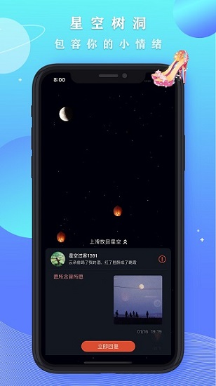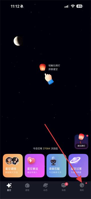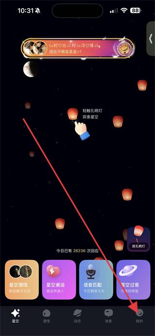 1.用戶下載安裝好軟件后,進(jìn)入星空之遇app,”星空“可以讓大家放孔明燈,隨機(jī)點(diǎn)擊別人的,就能進(jìn)行匹配交友,不僅如此,大家還能收到別人發(fā)送的漂流信息哦;