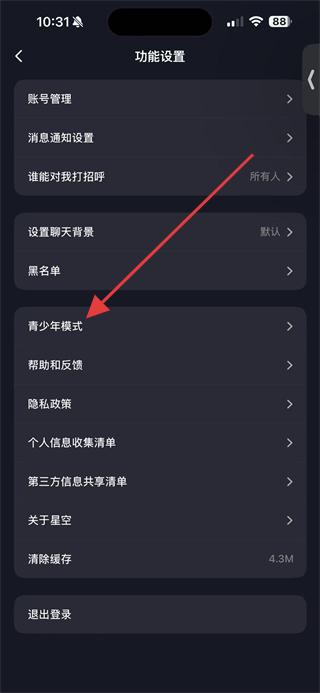 3、在功能設(shè)置頁面中點(diǎn)擊青少年模式,進(jìn)入青少年模式設(shè)置頁面。