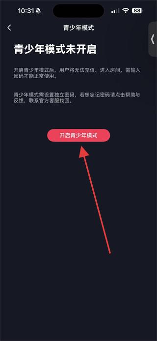 4、在青少年模式設(shè)置頁面點(diǎn)擊開啟青少年模式按鈕,按提示完成青少年模式開啟操作。
