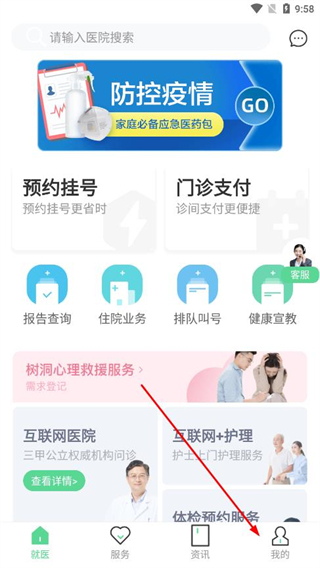 3、首頁(yè)改版,增加互聯(lián)網(wǎng)醫(yī)院、互聯(lián)網(wǎng)+護(hù)理、體檢預(yù)約等醫(yī)療服務(wù)入口;