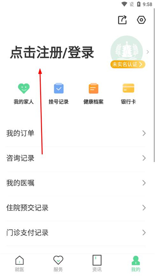 2、在我的頁(yè)面中,點(diǎn)擊點(diǎn)擊注冊(cè)/登錄區(qū)域。