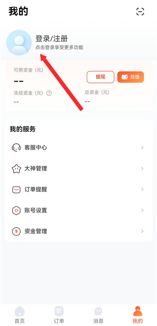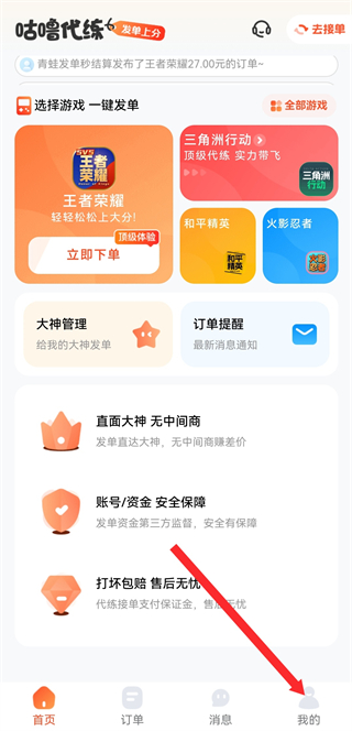 1、打開咕嚕代練APP,點(diǎn)擊右下角我的,進(jìn)入個(gè)人頁(yè)面。