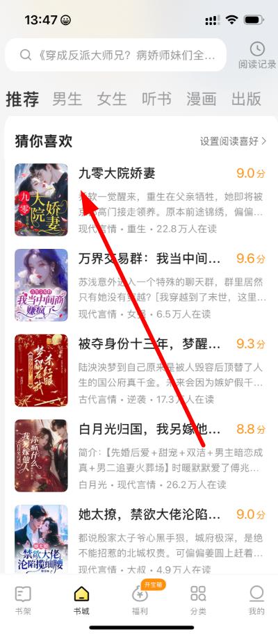 1、打開得間小說(shuō)APP在書城的推薦等欄目中,選擇想下載的小說(shuō),如《九零大院嬌妻》,點(diǎn)擊進(jìn)入閱讀界面。