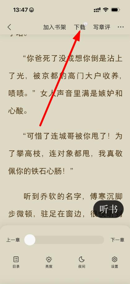 2、在小說(shuō)閱讀界面,點(diǎn)擊屏幕上方,找到下載按鈕并點(diǎn)擊。