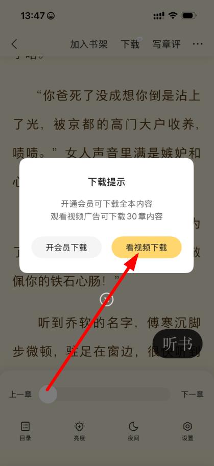 3、在彈出的下載提示窗口中,未開通會(huì)員,點(diǎn)擊看視頻下載,觀看視頻廣告后可下載30章內(nèi)容。