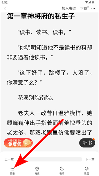 3、在閱讀界面,點(diǎn)擊左下角目錄選項(xiàng),展開目錄列表。