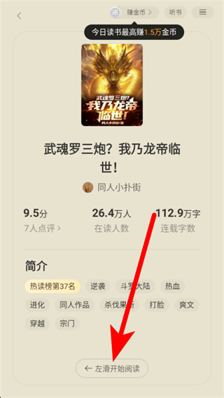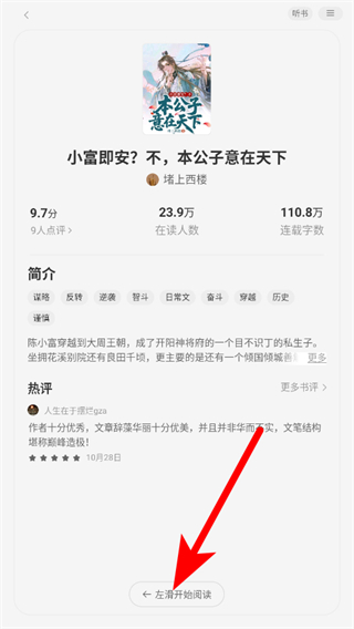 2、在書籍詳情頁(yè)面,點(diǎn)擊左滑開始閱讀選項(xiàng),進(jìn)入閱讀界面。