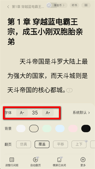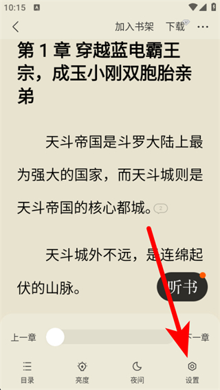 3、在小說(shuō)閱讀界面,點(diǎn)擊右下角設(shè)置選項(xiàng),展開設(shè)置菜單。