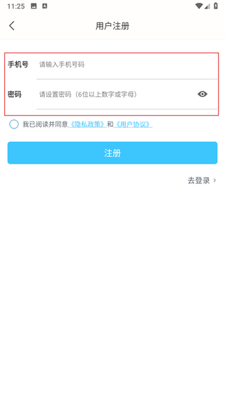 4、在用戶注冊(cè)頁面輸入手機(jī)號(hào)碼和密碼,點(diǎn)擊注冊(cè)按鈕。