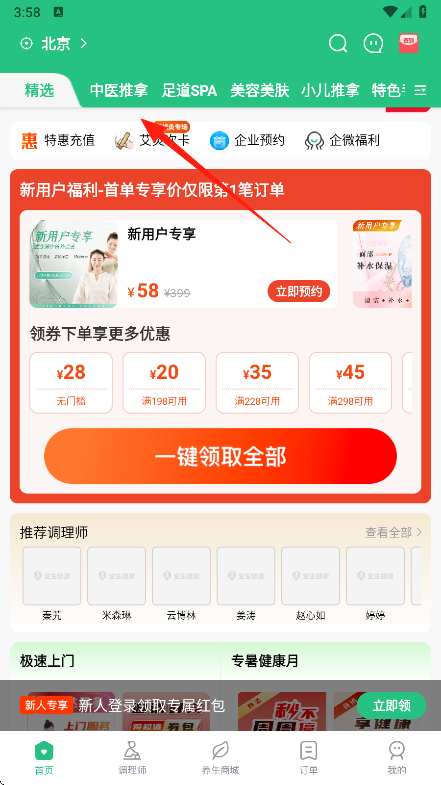 1、打開養(yǎng)生服務(wù)APP進(jìn)入首頁(yè),在頂部導(dǎo)航欄找到中醫(yī)推拿分類,點(diǎn)擊進(jìn)入該分類頁(yè)面,可瀏覽對(duì)應(yīng)調(diào)理師信息及相關(guān)服務(wù)項(xiàng)目,初步了解服務(wù)內(nèi)容。