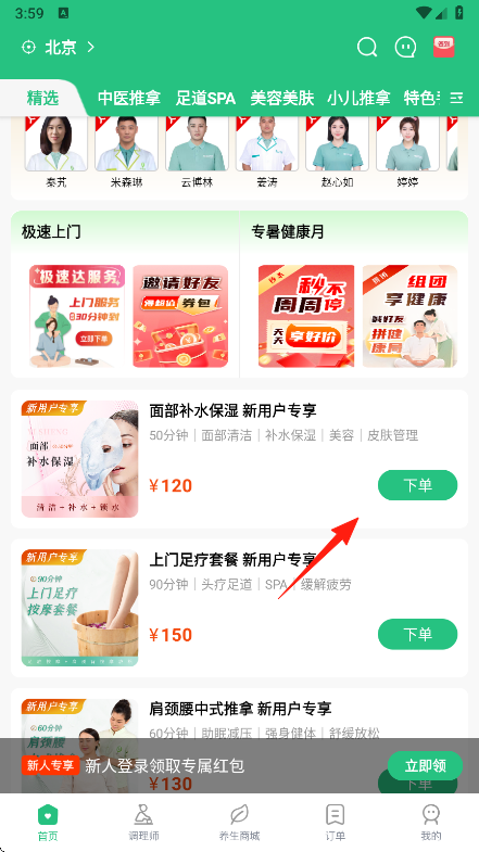 2、切換至極速上門或?qū)J罱】翟碌然顒?dòng)板塊,查看新用戶專享服務(wù),如面部補(bǔ)水保濕上門足療套餐等,選定服務(wù)后點(diǎn)擊下單按鈕,進(jìn)入訂單確認(rèn)流程。