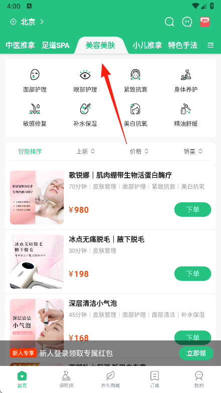 3、回到頂部導(dǎo)航欄,選擇美容美膚分類,進(jìn)入后可看到面部護(hù)理眼部護(hù)理等細(xì)分項(xiàng)目,挑選如肌肉繃帶生物蛋白酶療等服務(wù),點(diǎn)擊下單完成操作。