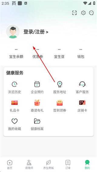 1、打開宜生健康A(chǔ)pp的首頁(yè),點(diǎn)擊底部的我的選項(xiàng),進(jìn)入個(gè)人中心頁(yè)面。