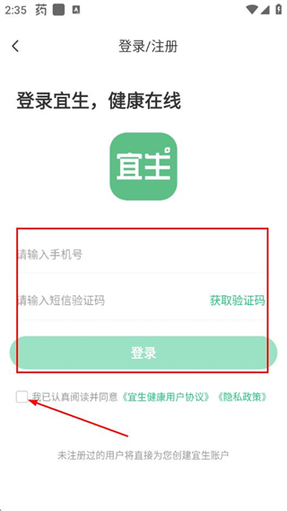 3、勾選用戶協(xié)議,輸入手機(jī)號(hào)、獲取并填寫驗(yàn)證碼后,點(diǎn)擊登錄,自動(dòng)完成注冊(cè)。